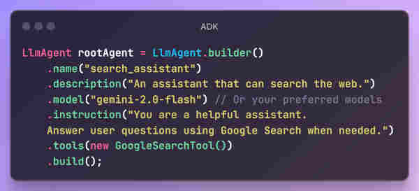 The ADK initially had an SDK just for Python, but now the initial version of the Java counterpart has been released. The kit includes a built-in development UI to help you test, evaluate, debug, and showcase your agents. Get started by adding it to your project through Maven: <dependency> <groupId>com.google.adk</groupId> <artifactId>google-adk</artifactId> <version>0.1.0</version> </dependency> A very simple example to start with is to build a Google search agent: