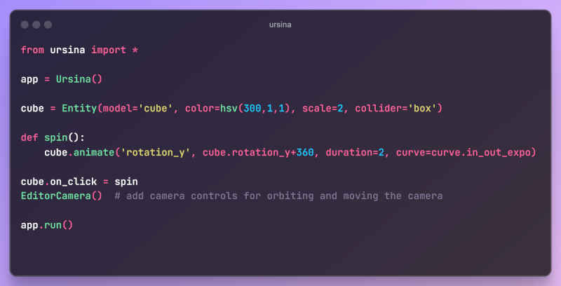 A quick way to build your very first game is by going through the Introductory Tutorial. Ursina is available for all popular platforms, MacOS, Windows and Linux. To install it just use pip : pip install ursina Also install the optional dependencies with: pip install ursina[extras] Now you're set to go writing your very first game with Ursina! To conclude, Ursina with its clean cut interface offers a first class opportunity for those already familiar with Python to add game development into their skills arsenal as well. Why not? More Information