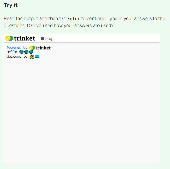 In the first Explore project "Hello world emoji", learners create an interactive program that uses emoji characters as the visual element.In the 2nd project "Target practice", they create an archery game by using the p5 library.And finally in project "Rocket launch" they learn to animate a rocket launching into space. In the first Design project "Make a face", they'll use the skills gained by working on the Explore projects, to draw a face.In project 2, "Don’t collide" they learn to build a fun game where a character or vehicle moves down the screen while having to avoid obstacles. Finally, in the sole Invent project, learners put everything that they have learned together in order to design their own unique patterns and create frame-by-frame animations. The path is expected to be completed in around six one-hour sessions, with one hour per project. In order to participate you just need your browser and be ready to type code in an embedded editor called Trinket. Enjoy!