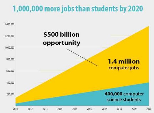 Giving Software Developer an Overall Score of 8.4 out of 10, US News states: The Bureau of Labor Statistics projects 22.8 percent employment growth for software developers between 2012 and 2022, much faster than average for all occupations. During that time period, an estimated 139,900 jobs will need to be filled. The profession's superb job prospects, low unemployment rate and excellent median salary helped it grab the coveted No. 1 spot in our ranking of the Best Jobs of 2014. The skills gap, i.e. the predicted shortage of computer science graduates to fill future jobs in computing, was one of the motivating factors behind the formation of Code.org and its Hour of Code initiative last December. And perhaps the publicity given to its stark statistic that there will be a million more jobs than students to fill them by 2020 has already had an impact.