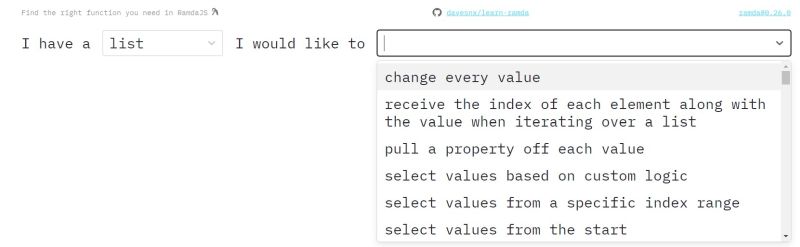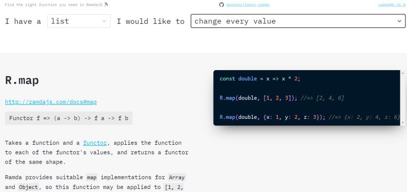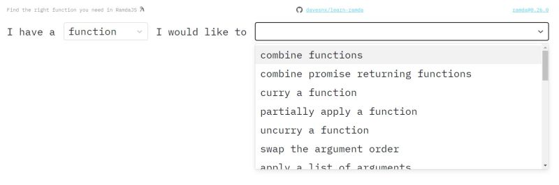 Ramda, a library which makes functional programming in JavaScript easy, gets its own playground. We take a look around and come up with a recommendation. But why RamdaJS? Can't I do FP in vanilla Javascript? Sure you can, but the difference is that RamdaJS is a library specifically designed for the functional style of programming: RamdaJS emphasizes a purer functional style. Immutability and side-effect free functions are at the heart of its design philosophy. This can help you get the job done with simple, elegant code. Ramda functions are automatically curried. This allows you to easily build up new functions from old ones simply by not supplying the final parameters. The parameters to Ramda functions are arranged to make it convenient for currying. The data to be operated on is generally supplied last. The problem is that Ramda has nearly 200 functions so it can be difficult to know which to use and when. For that reason there's a cheatsheet that "lists the most common actions you may wish to perform and the functions that are most likely to be suited to the task". It acts like an index. For example, when I'm looking to "change every value", I find the entry which points to the related function - in this case it's "map". Very helpful, but there is room for improvement. and this is provided by the "Learn Ramda, the interactive way" online playground which takes help to another level. Instead of looking up in a static list, this is a UI with which you can find the appropriate method interactively! It starts with a simple "I have a" dropdown list of scenarios,which matches against a "would like to" dropdown with actions. Making your choice forms a sentence like "I have a list and I would like to change every value", an action that reveals the related Rambda documentation and code samples.