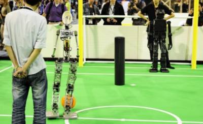 The skills required are identifying the ball, aiming and kicking it. One robot first takes the penalty shots and then plays in goal when it’s the opposing side’s turn to shoot. The ball is placed behind the robot, which then has to recognize and locate it. One thing you'll note in this video, of the Adult Size 2013 final in which Japan met Taiwan is how two humans hover behind their respective robots ready to catch them in the case of a fall: