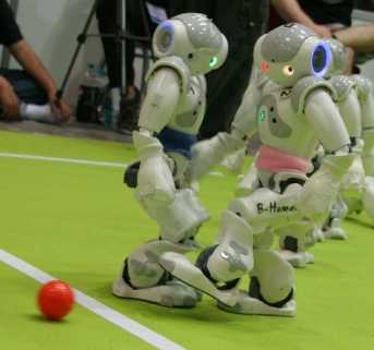 Now you can see what Nao sees as it takes part in a game in the standard platform class of the recent world cup. This particular Nao belongs to team B-Human, which is playing in the red shirts. As you watch the video, you see two views of the game, complete with object recognition bounding boxes. It is interesting to follow what the robot has accurately detected and what it does as a result. The top window shows the distant view and the lower window shows the view at Nao's feet. There is much falling down - but being Nao robots the players have no problem in getting back up. It does make you question of how far away the day is when robot soccer players will be as stable as their human counterparts and only fall to the ground when it is strategically advantageous. On the positive side, there are some very impressive passes early in the video:
