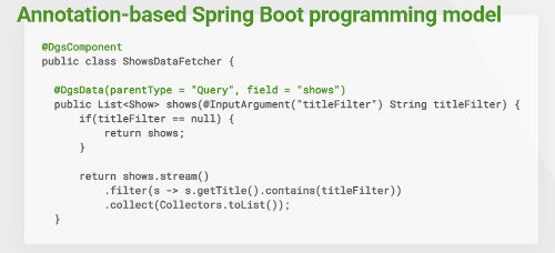 Netflix has open sourced its DGS Framework (Domain Graph Service) GraphQL server framework for Spring Boot. Starting out as a tool internal to the corporation, it has been generously open sourced for the rest of us to enjoy. Netflix is one of those organizations that have gone beyond REST, embracing GraphQL instead. Rather than exposing a myriad of microservices to UI developers, Netflix opted for a unified API aggregation layer at the edge, powered by GraphQL. Since they also use Spring Boot for their infrastructure, merging was bound to happen. As such the DGS framework is built on top of graphql-java and in essence it offers a layer of abstraction over the library's low-level details. While exclusively written in Kotlin (requires Kotlin 1.4), the framework mainly targets Java as Java is most closely associated with Spring Boot.That said, you are free to write your code in Kotlin too. Integrating the library is easy since it too utilizes Spring Boot’s annotation-based model. For example in implementing a Data Fetcher (constructs which return the data for a query) you use the following annotation based snippet :
