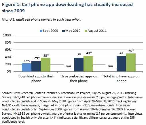Half of U.S. adult cell phone owners have apps on their phones. However, having apps does not necessarily mean using apps so it's important to ask which apps are preferred and how often they are used. When you take into account the proportion of adult cell phone owners who have downloaded an app to their phone (38%) and the proportion who purchased a phone already equipped with apps in the past year (43%), half (50%) of U.S. adult cell phone owners now have apps on their phones.The rate of app downloading has seen a steady increase since 2009.