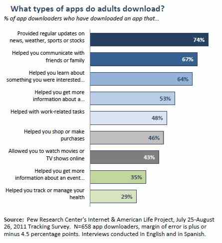 This result comes from the latest Internet & American Life Project report. The survey, conducted by the Pew Research Center in August 2011, also included questions about mobile app use on tablet computers. It revealed that among the 10% of adults who currently own a tablet, three-quarters (75%) had downloaded apps to their tablet. This translates to 8% of all U.S. adults but as 82% of tablet app downloaders had also downloaded apps to a cell phone there is considerable overlap between the two groups of device owners. The current survey asked the app users (a sample size of 658) if they had ever downloaded nine different types of apps. The most popular were those that provide regular updates about everyday information such as news, weather, sports, or stocks (74%), those that help people communicate with friends and family (67%) and those that help the user learn about something in which they are interested (64%):