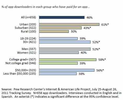 The Internet & American Life Project collects a great deal of demographic data which reveals trends in the appeal of different types of app. For instance, African-Americans and young adults are more likely than others to download apps that help them communicate with friends and family. And overall, men are more likely than women to download apps that help them make purchases and those that help with work-related tasks. The new survey also found that among adult cell phone users who have downloaded apps, just under half (46%) have paid for an app at some point; this is unchanged from the 47% of downloaders who said the same in the previous survey (May 2010). This time questions were included on the amount paid for an app. Among those who have paid for apps, half (52%) report that the highest dollar amount they have paid for an app is $5 or less. However, 17% have paid more than $20 for an app. Been willing to pay for apps differed by demographic group.