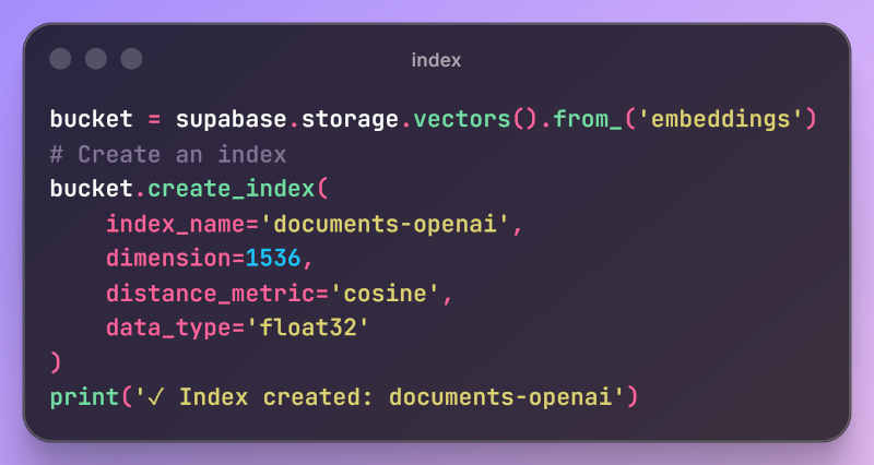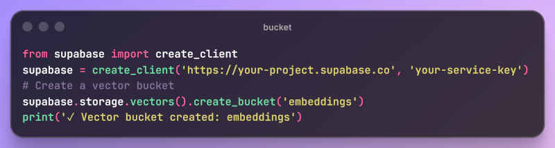 Digging into it, the main issue here has to do with latency and real time performance. Therefore it is recommended to store hot vectors in pgvector for the highest-traffic, most latency-sensitive queries and warm or cold vectors in Vector Buckets for everything else. Architecturally, Vector Buckets follow the same principles of Amazon S3 vector stores. Built on S3-compatible storage, it's a cloud object store with native support to store and query vectors; that means that it can cope with great amounts of data. Each vector index supports up to tens of millions of vectors (50M per index at the time of writing) and you can create multiple indexes per bucket (for tenants, models, or domains). Indexes and Vectors aside, each vector bucket also contains metadata that keep additional context about vectors (text, tags, IDs, etc.) The workflow for utilizing Buckets them is as follows: 1.Create a bucket to organize your vector data 2.Create indexes within the bucket with specified dimensions and distance metrics 3.Store vectors with embeddings and optional metadata 4.Query vectors using similarity search to find nearest neighbors You can do that through the Supabase Dashboard or through code using the SDK. Here's the SDK apporach for steps 1 and 2: Create bucket