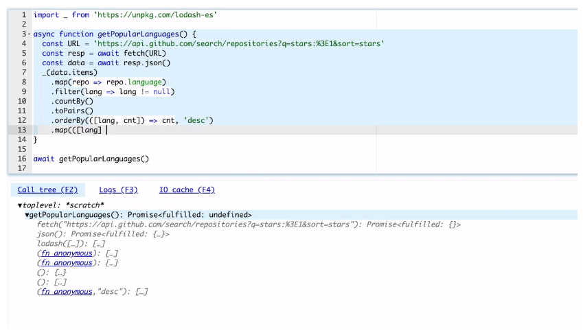 That said, there's one pre-condition for using Leporello. Because it is finetuned to functional Javascript programming and still in active development with loads of todos, it supports a subset of Javascript. Mainly: Variables are declared using the const declaration. The use of var is not supported. let variables can be declared without an initial assignment, which is useful in cases where the value depends on a condition Loops of any kind are not supported. Instead, consider using recursion or array functions as alternatives. Both traditional functions and arrow functions, with block bodies and concise bodies, are supported. Method definitions, however, are not currently supported. Classes are not supported at the moment. There is a possibility of supporting some form of immutable classes in the future. The this keyword is not currently supported, but the new operator can be used for instantiating built-in classes. On the other hand, ES6 modules, async functions and await are fully supported. Don't let that shortcomings stop you from trying it out though. Watch the demo of what you can do with the tool, and you'll find out that