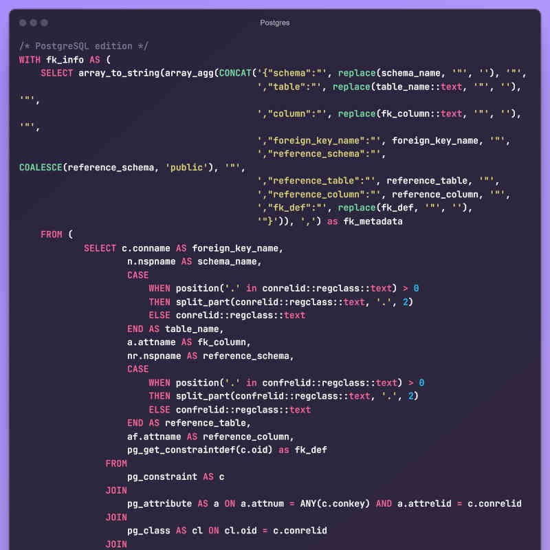 which you can clone to modify and use. As mentioned, ChartDB comes in two flavors, self-hosted or Cloud based. To host it yourself you can build it from source by cloning the Github repo or grab the docker image for easiness. Amongst the aforementioned features, there's one that stands out - the Import your database schema with a single query as they say. What that means is that upon clicking Import and choosing a dbms say Postgres, a single query is revealed that can reverse engineer the whole schema of the database. You then copy and paste the query locally in your database's client to get the exports which you can then use to import the schema to the editor. The query is too long to relay here, so just a few lines are being displayed but it is mind-blowing :
