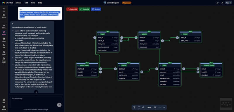 This time it's going beyond manually drawing ERDs ands lets you create schemas using natural language just by describing what you need. In essence it enriched the standard UI with another option, that of the Agent. Clicking on the Agent icon and choosing one of the default templates, such as "Design a database like Spotify", gets expanded to the prompt: Design a database schema like Spotify with tables for users, artists, albums, tracks, playlists, and listening history and voilĂ there is your schema appearing: You also get a nice description with it : The database schema consists of seven tables: I went a step beyond in trying to reverse engineer a popular Spring project up on GitHub: Prompt: Create the database of project spring-petclinic Thus this means that you can get the underlying database schema of any application that is backed by a database and exposes its source. Of course you can also make your own customized schemas by writing your manual prompts like Design an e-shop for selling video games As mentioned together with the diagram you get a high level description too, which in this case amongst others includes the following paragraph: Primary keys are defined for each table, and foreign key constraints are used to establish relationships between tables. SERIAL is used for auto-incrementing primary keys. DECIMAL is used for monetary values. TIMESTAMP WITH TIME ZONE is used for storing timestamps. CHECK constraint is used to ensure rating values are within the valid range. Finally you can export the DDL to import it into your database and get going from there. As mentioned, ChartDB comes in two flavors, cloud-based or self-hosted. To host it yourself you can build it from source by cloning the Github repo or grab the docker image for convenience. More InformationRelated ArticlesDatabase Diagramming With ChartDB