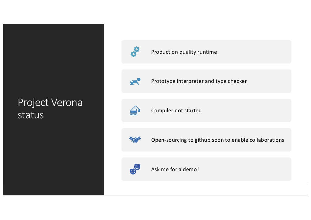Verona uses the idea of ownership to make the language more robust against memory errors. Unlike Rust, however, it makes use of ownership of groups of objects. It looks like being an interesting language and you can find out more of the detail and intentions from the video: An interesting language, yes - but do we need another language? Given the number of experimental languages that are given some attention and then die I doubt this has much chance of surviving unless it becomes an official Microsoft language - Rust#, say. Even then it means that we would have to choose between Rust and Rust#. So much better for Microsoft to join in with Rust and see if the language can be progressed in ways that suit its purposes. It might be that, after learning something from Verona, Rust can be improved in the same way. Microsoft needs a safer systems programming language to keep Windows and its other big projects in check. My honest opinion is that Verona is not intended to be a replacement for Rust and, while it is inspired by Rust and meets the same needs this, is by no means an example of the "embrace, extend and extinguish" mentality of the old Microsoft. More InformationDigital Security by Design: Security and Legacy at Microsoft - Matthew Parkinson, Microsoft Related ArticlesOxide - A Simpler Formalized Rust Rust 2018 Released To Improve Developer Productivity Rust 1.26 Adds Existential Types Rust Hits Stable 1.0 - So What?