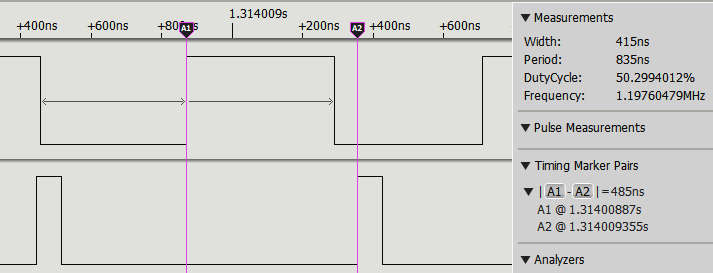 You can see that the event takes about 0.5µs to process and this leaves just enough time to catch the next rising edge on a 1.2MHz pulse. In practice, throughput would be lower than this. This is about the same speed as the level-reading program given in Chapter 6, but there are far fewer missed pulses due to the latching effect of using events. |